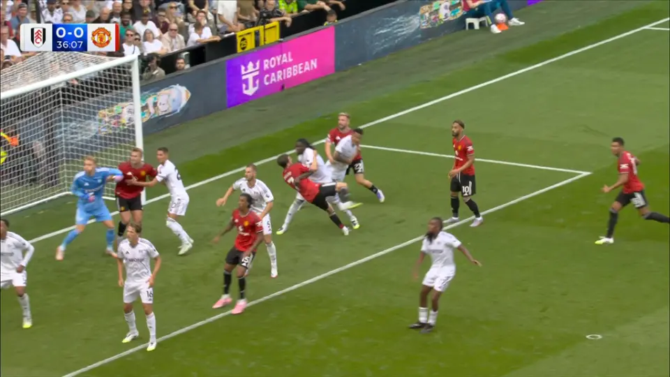 随后,视频助理裁判介入判罚,并且要求主裁判回看慢镜头。从慢镜头来看,巴锡的犯规动作非常明显,回看慢镜头之后,主裁判判罚点球,并且向现场球迷解释,“富勒姆3号球员对曼联7号球员犯规,判罚点球。”