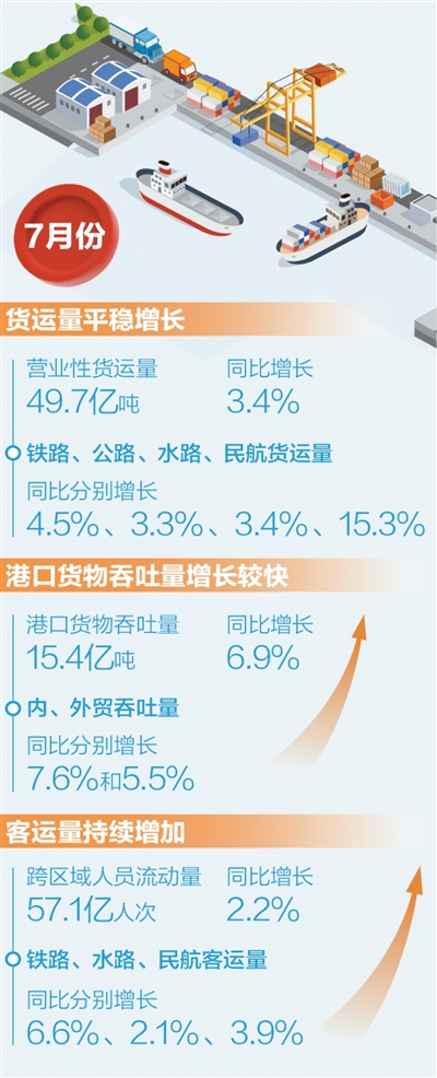 货运量保持平稳增长。7月份,完成营业性货运量49.7亿吨,同比增长3.4%,增速较上月回升0.5个百分点。分方式看,铁路、公路、水路、民航货运量同比分别增长4.5%、3.3%、3.4%、15.3%。1至7月,完成营业性货运量330亿吨,同比增长3.8%。