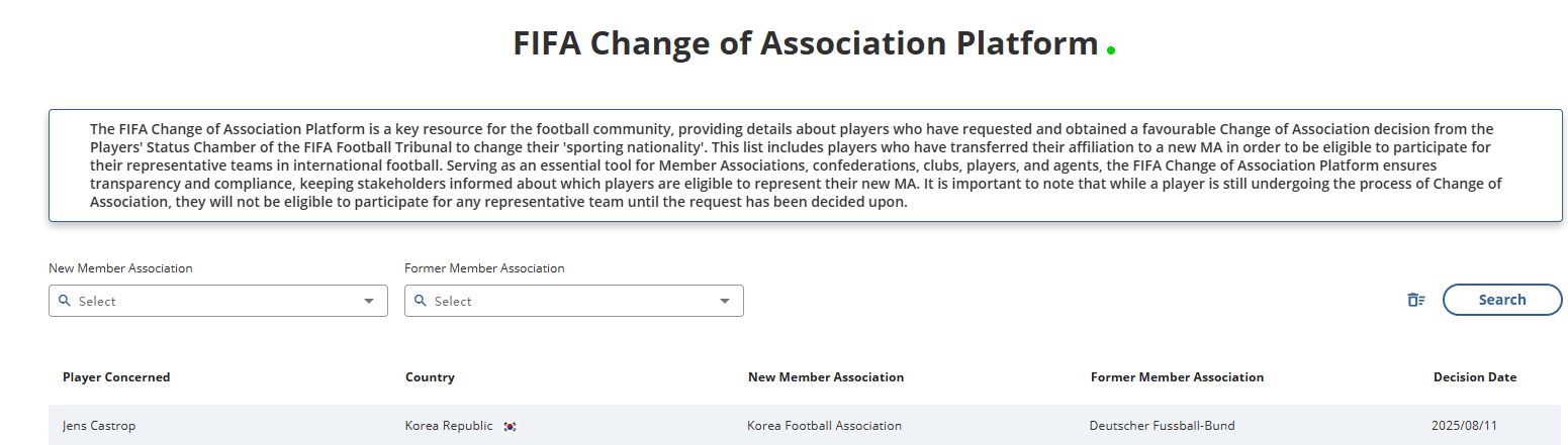虎扑08月12日讯 昨天,FIFA会籍转换公示网页更新显示:现效力于德甲门兴格拉德巴赫的中场球员延斯-卡斯特罗普(Jens Castrop)已加入韩国会籍。